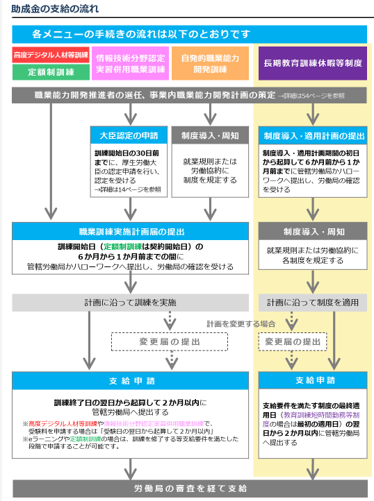 人への投資促進コースでは、長期教育訓練休暇制度や教育訓練短時間勤務等制度を用意し、労働者の自発的な職業能力開発を促進した場合の助成を拡充しています。